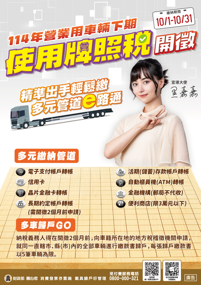 114年營業用車輛下期使用牌照稅繳納期間自10月1日起至