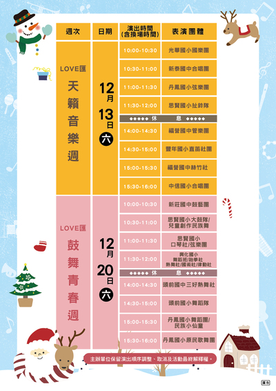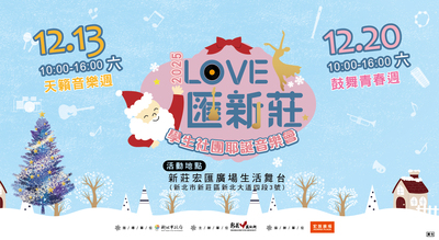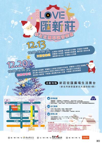 一、2025「LOVE匯新莊」學生社團耶誕音樂會將於12月13日及12月20日兩個週六於新莊宏匯廣場生活舞台盛大舉行,邀請新莊區16組在地國中小學生社團輪番演出,帶來國樂、合唱、扯鈴、管弦樂、鼓藝、直笛、舞蹈、原民歌舞等多元展演形式。以純真歌聲與青春能量,為冬季的新莊注入溫暖的節慶氣氛,點亮屬於市民的耶誕節。