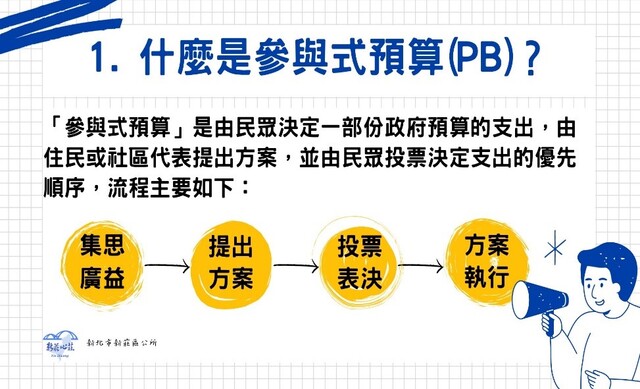 若您關心新莊社福發展,但錯過了先前我們舉辦的參與式預算活動,這邊提供您簡單的參與式預算(PB)小知識,讓您快速掌握重點。